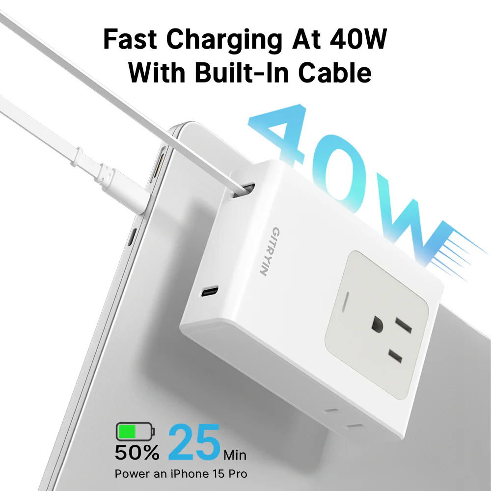 Gitryin travel plug adapter, featuring a 31.5-inch retractable cable, provides 40W charging with 3 outlets and 1 USB port, supporting international use from the US to Japan, China, Canada, Anguilla, and Barbados.