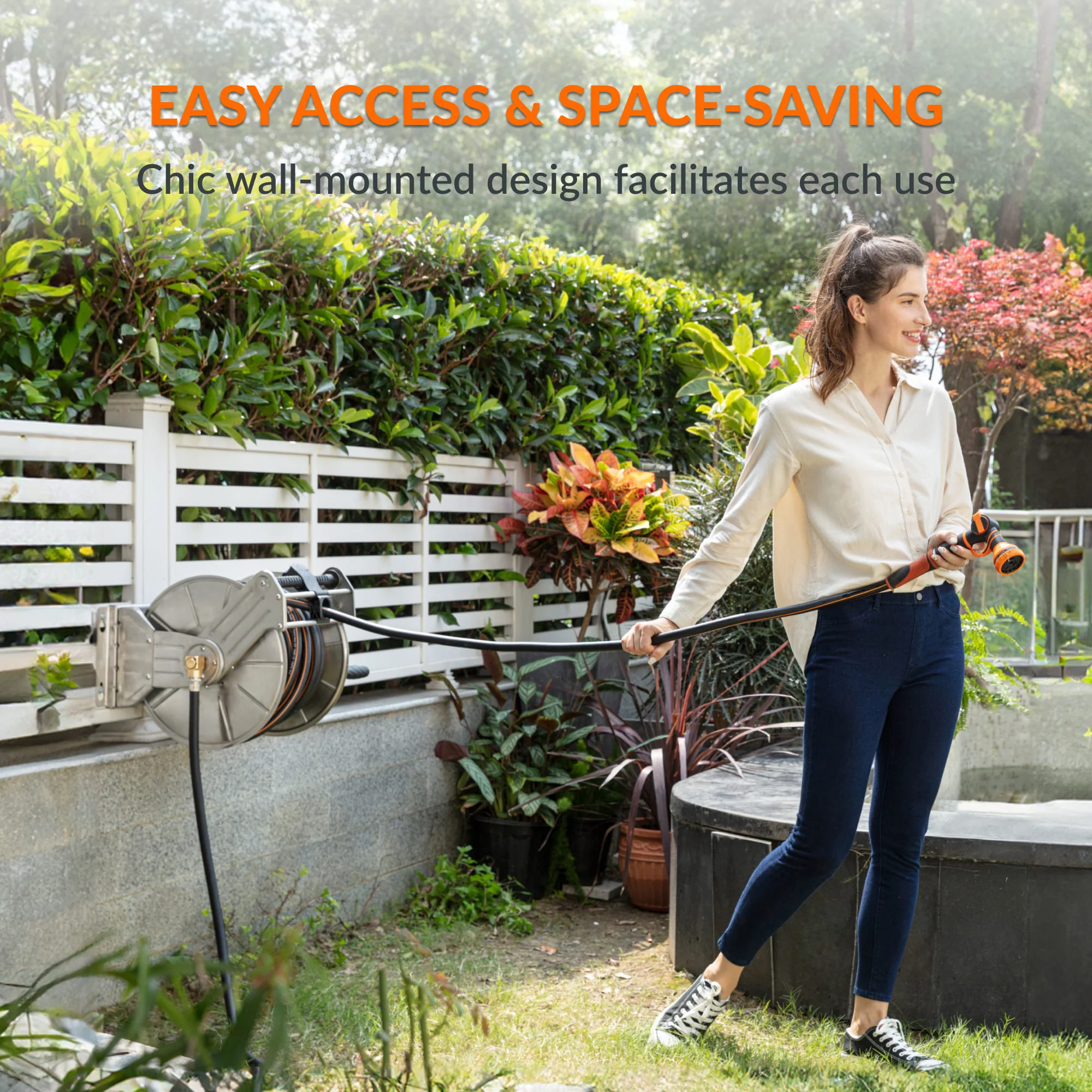 Organize your outdoor space with a 304 stainless steel wall-mounted hose reel from Giraffe Tools. Rust-proof, space-saving design for gardens, garages & patios.